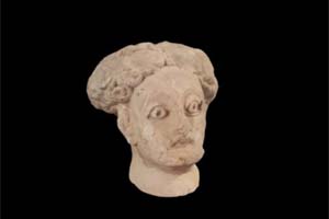 رأس تمثال أُموي، قصر هشام (خربة المفجَّر)، مصنوع من مادة الجِبص بطريقة القالب، على النمط الروماني، استُخدم في تزيين الحمّام الكبير. وكافة تفاصيل الوجه واضحة، كالفم والأنف والأُذنين، ويبدو أن خرَزاً أو طقة زجاجية كانت موضوعة مكان العين، وخُصلات الشعر ظاهرة. ويُعتبر هذا التمثال استمراراً للتقاليد الرومانية والبيزنطية في نحت التماثيل.
